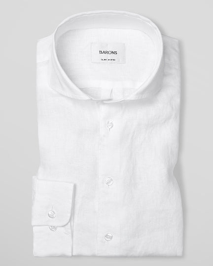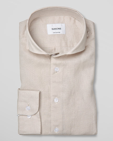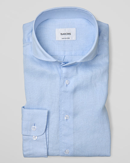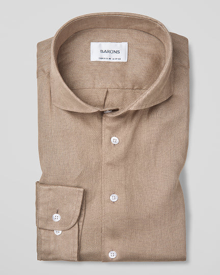 Din följeslagare genom sommaren – från kontoret till kusten. Tyget är extremt luftigt och andningsbart – du märker skillnaden direkt. Med en vikt på endast 125 gsm känns tyget svalt mot huden och blir bara bättre ju varmare det blir. Ja, linne skrynklar. Men det är precis meningen. Linne har sin helt egna karaktär – och i våra ögon, sin egen charm. Designet är baserat på våra klassiska silhuetter, men med extra rörlighet i ryggen, tack vare ett diskret boxveck. Skjortan är skuren med en extreme cutaway-krage, som ger ett mer avslappnat uttryck – utan att det påverkar det skarpa utseendet som kännetecknar skjortor från BARONS. Den perfekta sommarskjortan. Vävd i 100% EU-certifierat linne, odlat i Nederländerna, Belgien och Frankrike. -